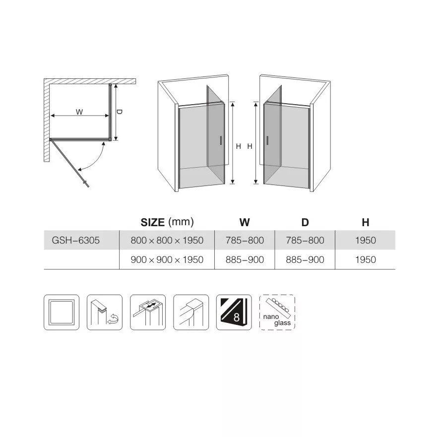 A 90 × 90 cm-es méret és a 195 cm-es magasság révén sokféle fürdőszobába könnyen beilleszthető. A 8 mm vastag, átlátszó edzett üveg tartós és biztonságos, így hosszú távon is megbízható megoldást nyújt.