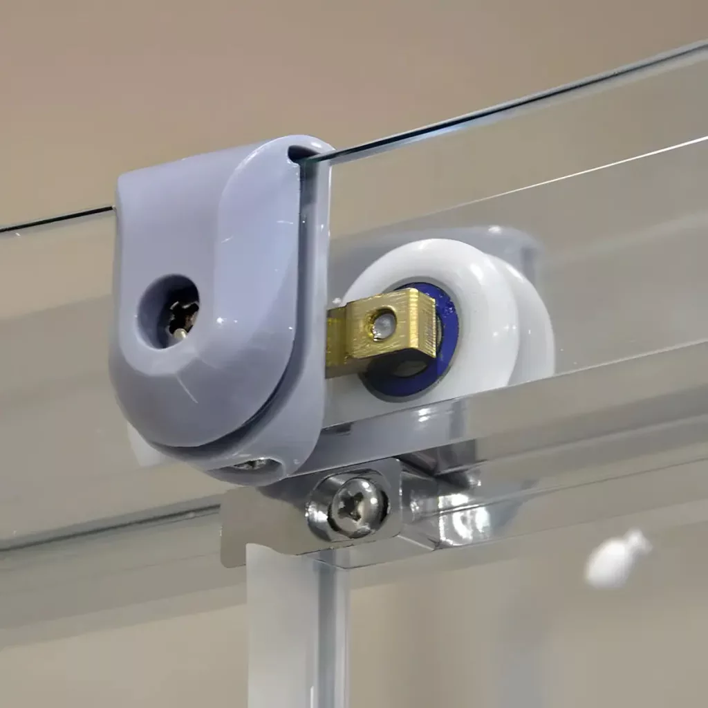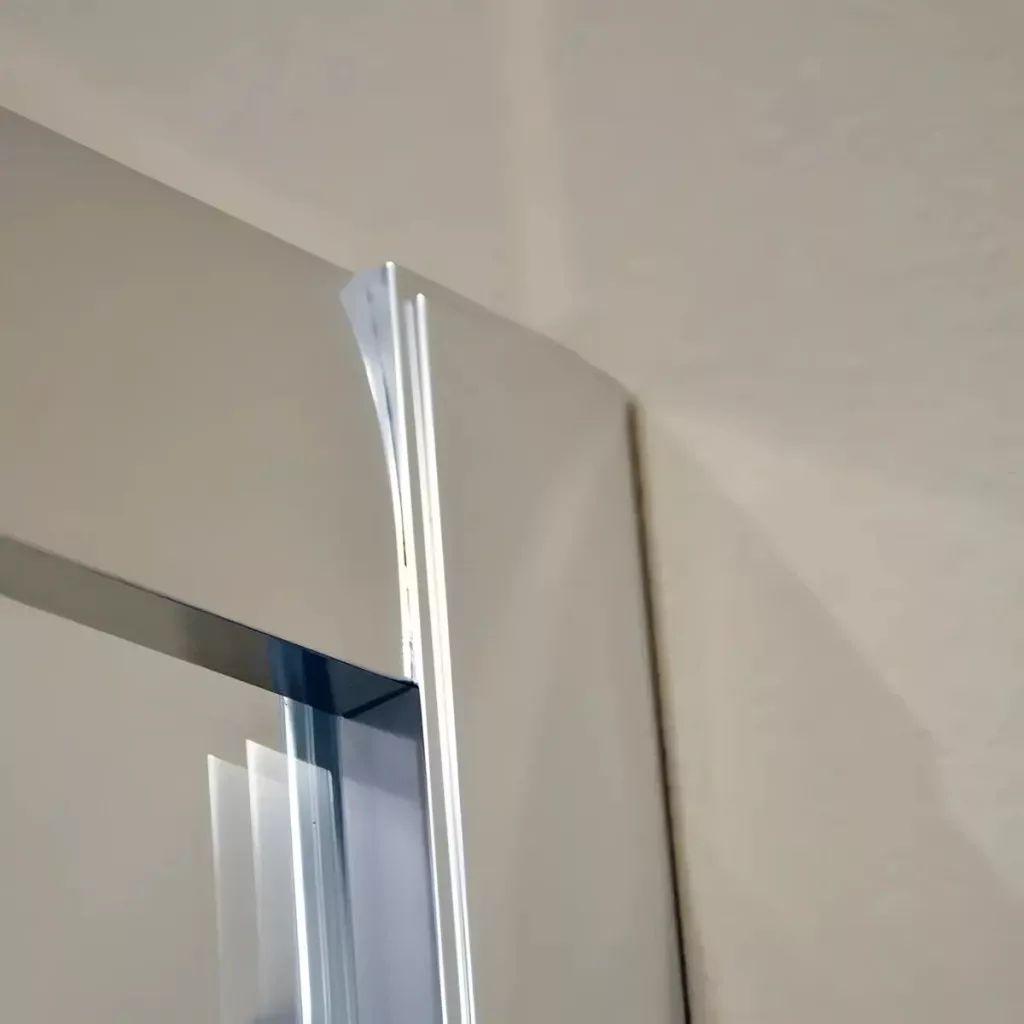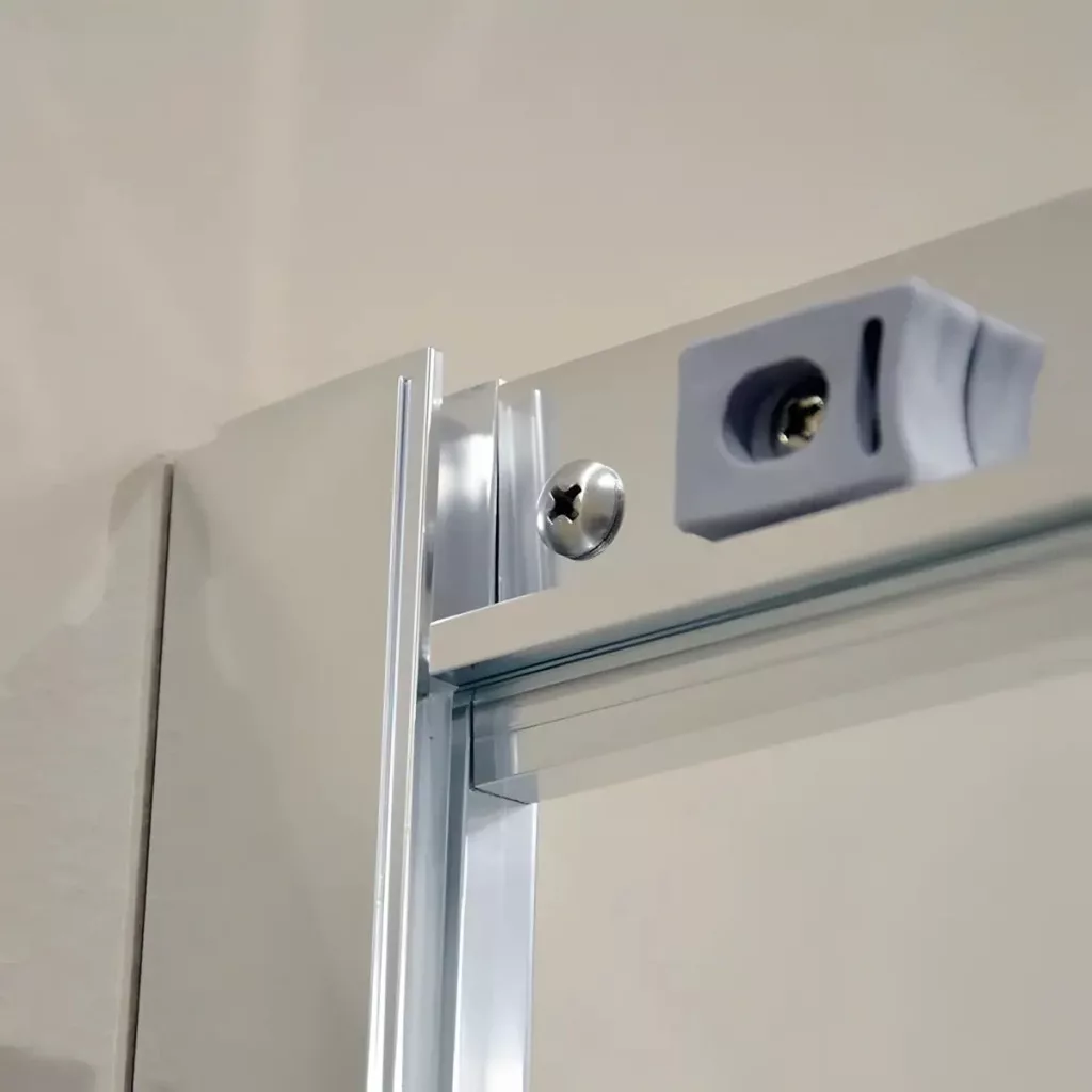 A tolóajtó mágneses zárral van ellátva, így könnyű hozzáférést biztosít, és megbízhatóan zár, csökkentve a vízszivárgás esélyét. A krómozott műanyag fogantyú és a dupla műanyag kerekek kényelmes, hosszú élettartamú használatot tesznek lehetővé. Az alumínium fali keret 15 mm-es állíthatósága, valamint az ajtó függőleges szélein található átlátszó PVC vízálló tömítés garantálja a biztonságos, egyszerű telepítést, miközben a dizájn tökéletes egységet alkot.